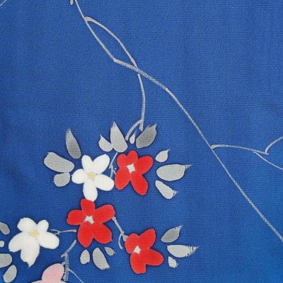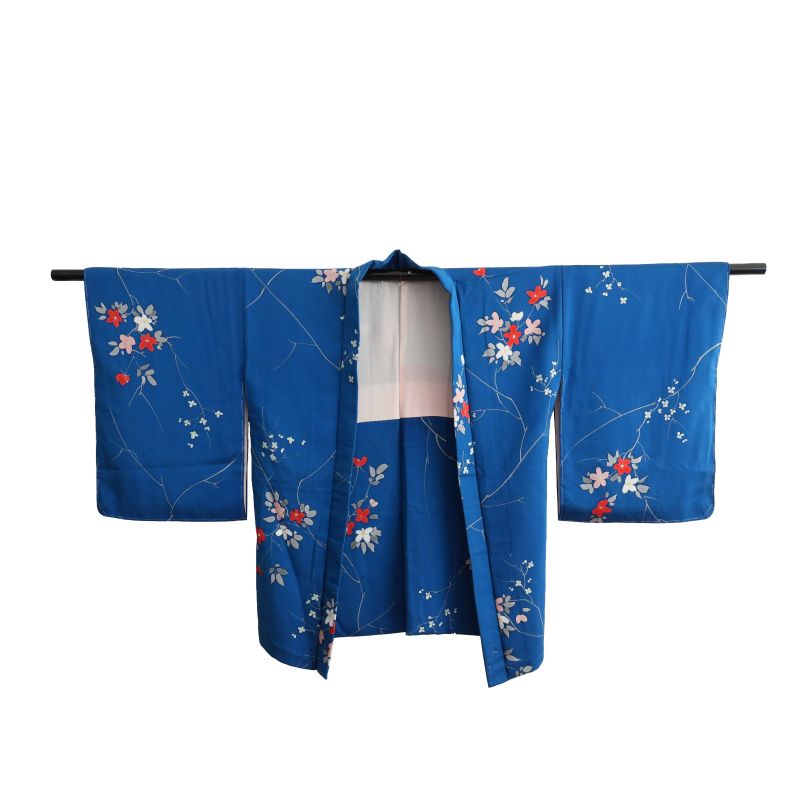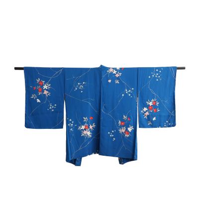 Este haori (羽織) de seda en tono azul intenso destaca por su estampado floral delicado, con pequeñas ramas y flores en tonos suaves que aportan contraste y movimiento. Es una pieza muy favorecedora y fácil de combinar, el azul aporta profundidad y el motivo floral suma un toque japonés elegante sin recargar.